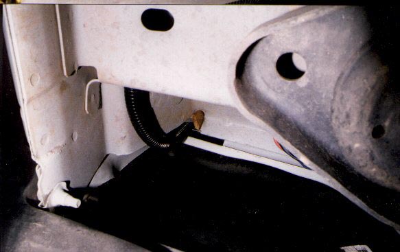 | This should be the driver side, looking forward and up, just behind the mudflap. The wires run up the inside of the fender. |